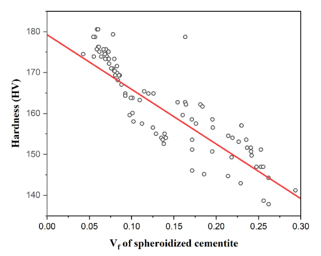 between the spheroidized cementite volume fraction and the surface hardness. The method