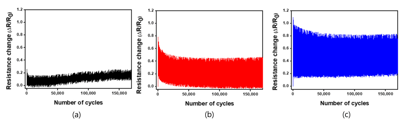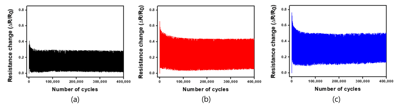 CNT 배열들이 일부 회복하면서 조금 더 낮은 저항값을 유지하게 된다[12]. 각 샘플 모두 400,000회의 반복 사이클에서도 매우 안정된 저항 변화를 보여주고 있으며, 제작된 신축성 스트레인 센서의 기계적 내구성이 매우