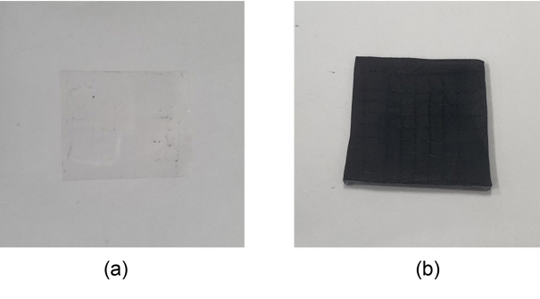 기판과의 접착력을 향상시켰다. 신축성 스트레인 센서를 정사각형 모양(2 mm × 2 mm)로 제작한 후, cross cutter로 격자 모양을 형성하였다.