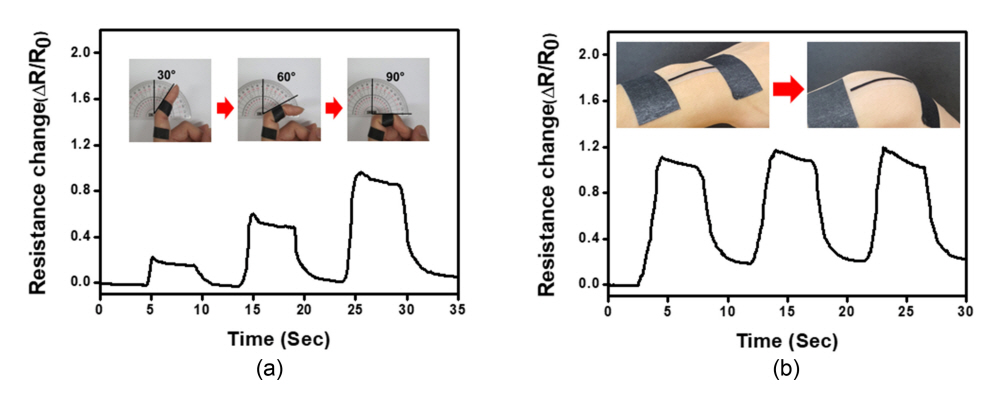 제작된 신축성 스트레인 센서의 웨어러블 스트레인 센서로의 적용 가능성을 알아보기 위해 인체 부착 시험을 통해 센서가 인체의 움직임을 정확히 감지해낼