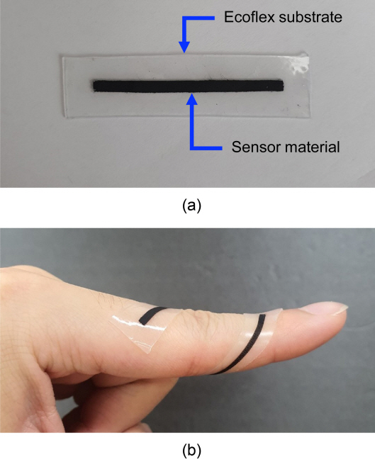 결과 센서 소재와 Ecoflex 기판과 접착력은 매우 우수함을 검증하였다. 인체 부착 시험을 통해 센서의 성능을 확인하였다. 스트레인 센서는 손가락