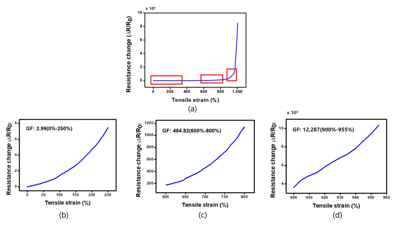 및 900%-955%의 각 구간에서의 GF는 각각 2.99, 484.82, 12,287 이었으며, 각 구간의 상세 그래프가 그림 7(b), (c), (d)에 나타나 있다. 각 구간의 선형결정계수 r2값은 0.92 이상으로 모두 높은 선형성을 보임을 알 수 있었다. 한편 인장변형율 955% 이상의 구간에서는