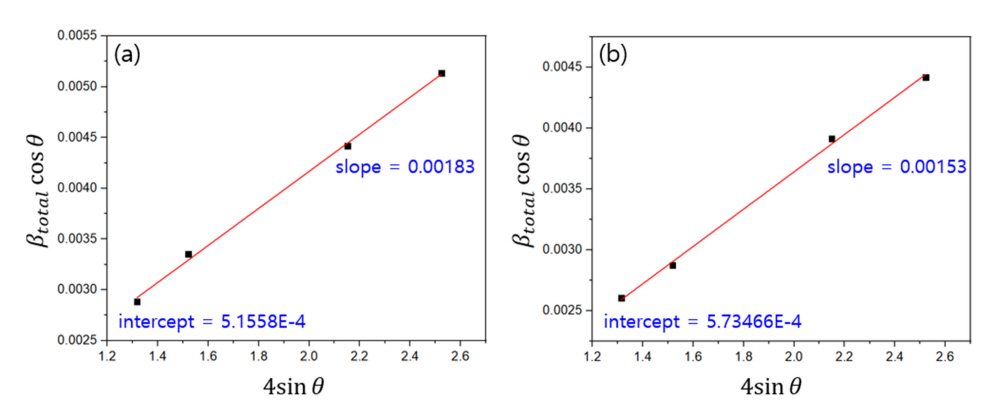 The plot of the βtotal · cosθ vs. 4sinθ for A356.2: (a) as-built, (b) 480°C-6h heat treated sample.