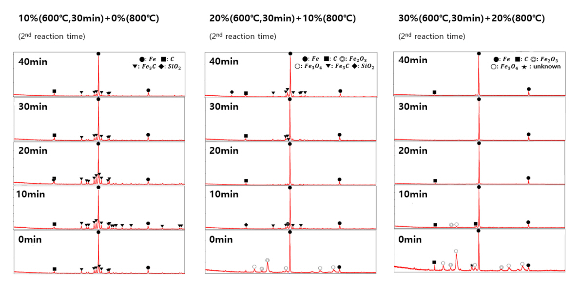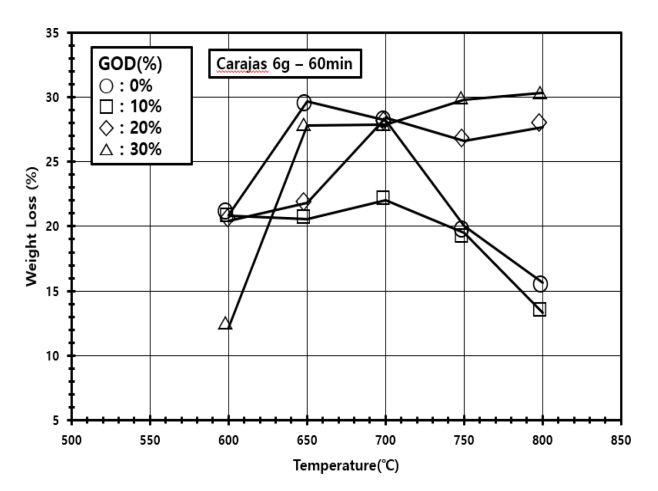 at ~700 °C irrespective of the GOD value. However, the carbonization of reduced iron