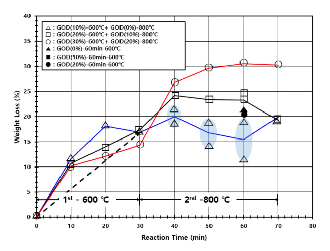 2) With the reaction temperature fixed at 600 °C in the 1st stage and at 800 °C in the 2nd stage, the correlation between the operating time and GOD value was investigated.