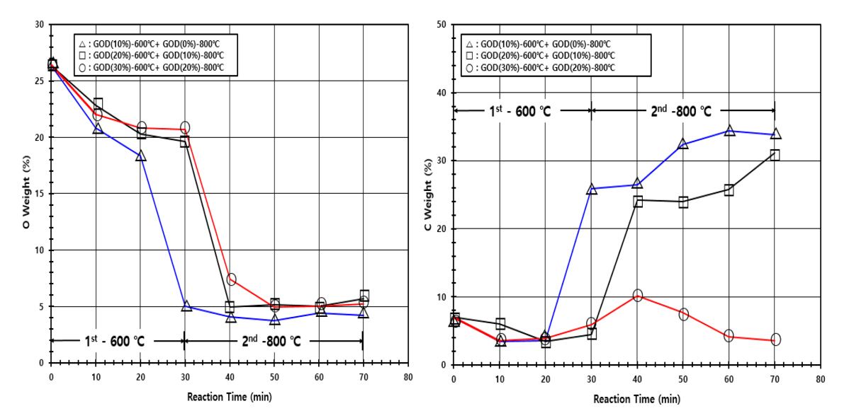 Then the reduction and the subsequent carbonization is completed in the 2nd stage at a high temperature of ~800 °C with a low GOD.
