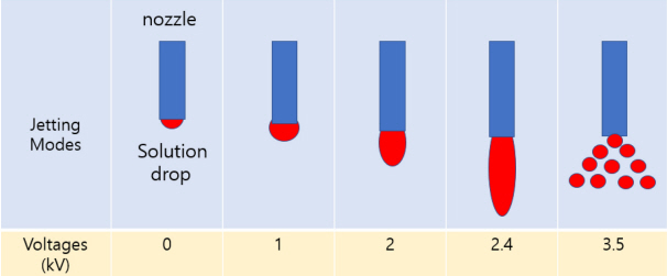 노즐과 기판사이에 높은 전압을 인가한다. 이때 발생하는 전위차로 인하여 노즐 끝에서 용액의 토출 (jetting)과 분산(spray)이 일어나게 된다.