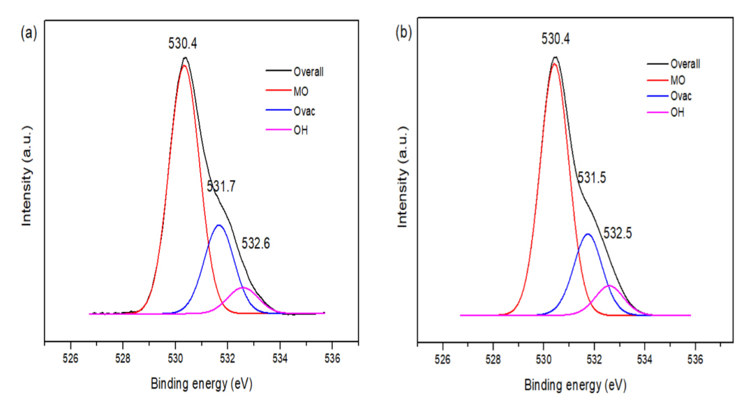 region)과 연관된 O2- 이온 (VAC)에 의하여 나타나는 것이고, 마지막으로 높은 결합 peak는 531.6 eV 부근에 나타나며, 이는 금속산화물의 표면에 흡착된 수분이나