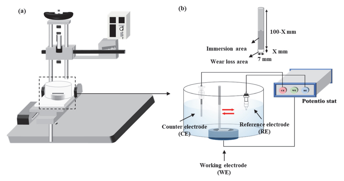 마모 하중 인가가 가능하도록 제작됨)이며, 용액에 노출된 시편이 외부와 전기적 접촉이 가능하도록 시편홀더 하단부로 전선연결이 이루어졌다 (그림 1 (b)).