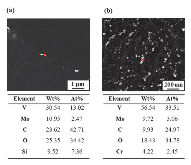 경우 Cr, Mo 성분이 포함되어 있음을 알 수 있다. 이는 V, Mo, Cr은 유사한 크기의 원자 반경으로 인해 V-carbide 내 Cr, Mo