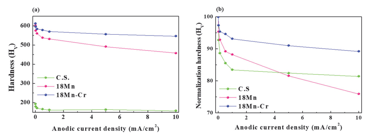 (a) Vickers hardness measured after the galvanostatic polarization test; (b) normalized