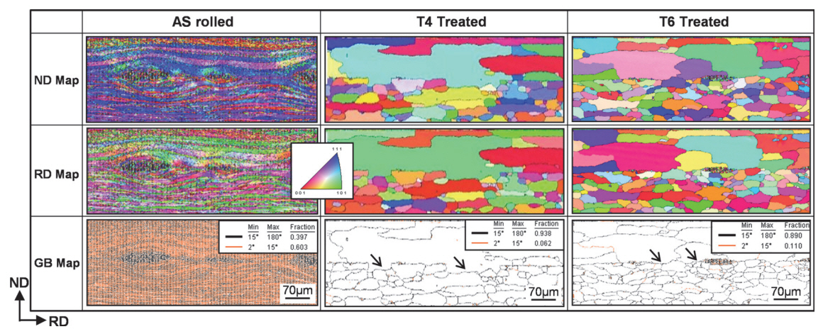 The ND, TD and GB maps measured at various regions of the as-rolled and the T6-treated