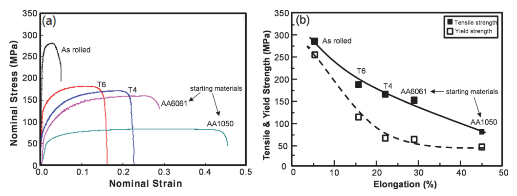 Fig 7 shows nominal stress-nominal strain(s-s) curves (Fig 7a) and the mechanical properties (Fig 7b) of the asrolled and the age-treated materials for the 2-layer stack CRB. The starting