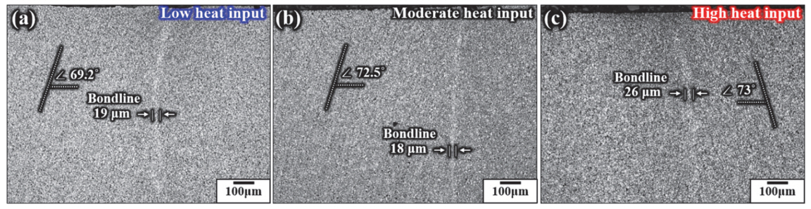 (a) low heat input (279 kW), (b) moderate heat input (292 kW), and (c) high heat input