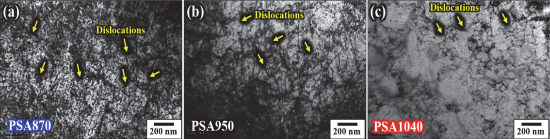 subjected to different PSA temperatures: (a) 870 ยฐC, (b) 950 ยฐC, and (c) 1040 ยฐC.