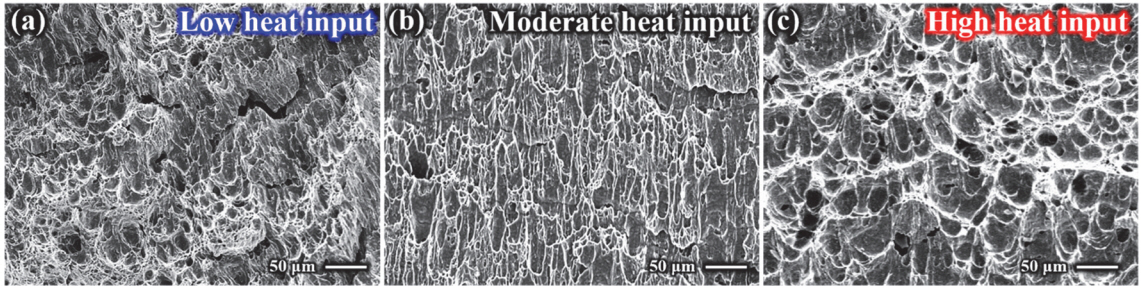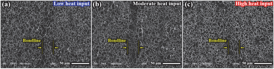 SEM images of ERW seam welds with different heat inputs: (a) low heat input (279 kW),