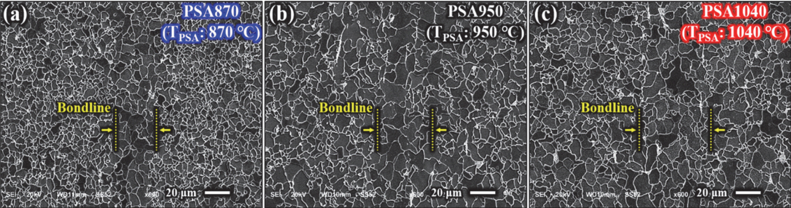 SEM images showing ERW seam welds subjected to different PSA temperatures: (a) 870
