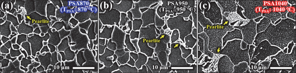 SEM images showing ERW HAZ subjected to different PSA temperatures: (a) 870 ยฐC, (b)