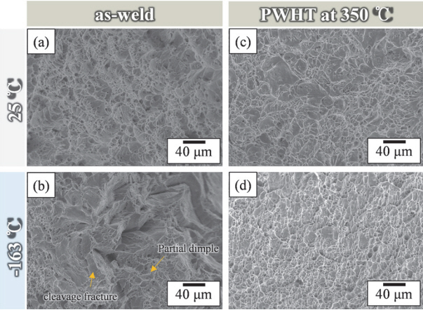용접 조인트와 달리, 350 °C 조건으로 열처리된 용접 조인트의 파단면에서는 벽개파괴 거동이 관찰되지 않아 연성 파단이 주요함을 알 수 있다. 이는