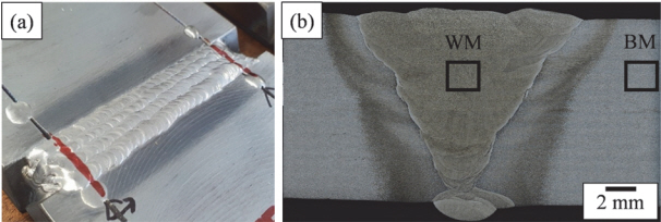 Fig 2은 Fe계 합금 용가재가 적용된 9% Ni강의 용접 조인트이다. 용접 비드의 외관은 건전하게 형성되었으며 (Fig 2 (a)), 용접 조인트의 절단면 SEM 이미지 확인 결과 특별한 용접 결함이 발견되지 않음을 알 수 있다 (Fig 2 (b)).