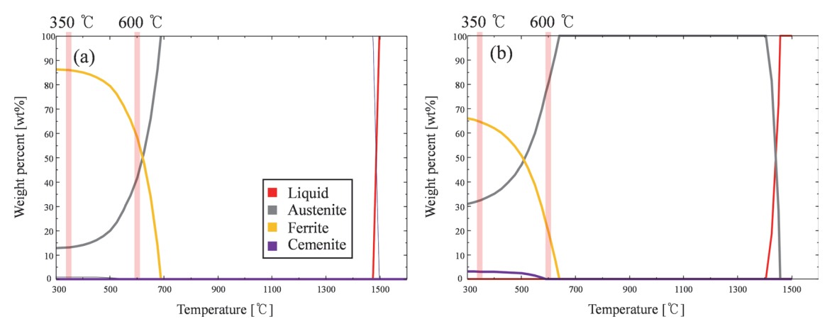 한편, Fig 4 (b)는 WM의 화학 조성에 따른 상태도이다. WM은 상온에서 오스테나이트 상분율이 24.9% [22]였으나, 온도가 350 °C, 400 °C 그리고 600 °C에 이르면, 33.9%, 36.9% 그리고 84.6%까지 오스테나이트 상분율이 증가한다.