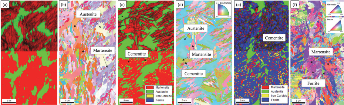 (Fig 7 (e))의 위상 맵 분석 결과 페라이트, 마르텐사이트, 오스테나이트 그리고 시멘타이트로 구성되었다. 열처리 중 C가 고용된 오스테나이트는 냉각 과정에서