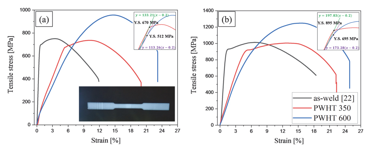 As-weld와 350 °C, 600 °C 조건으로 열처리된 용접 조인트의 응력-변형율 곡선 (Fig 9)에서 온도와 무관하게 서로 다른 특징의 인장 거동이 관측됐다. As-weld 시험편은 탄성 변형 영역에서 탄성 계수가 가장 높고 소성 변형 영역에서는