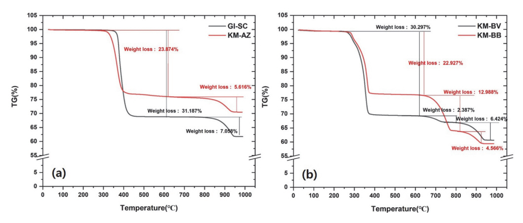 USA)으로 상온~1,000°C까지 20°C/min의 속도로 승온하며 분석하였다.