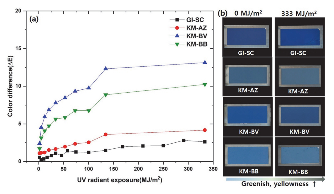 세부 시험조건은 표 2와 같으며, 이를 총 196 cycle 가동하여 안료의 내구성을 평가하였다. 196 cycle 시험하였을 때 누적광량은 334 MJ/m2으로 실제 우리나라 서울 기준 간접광에서 10년, 혹은 직사광에 수평으로 1년간 노출했을 때의 수명으로 예측할 수 있다[14].