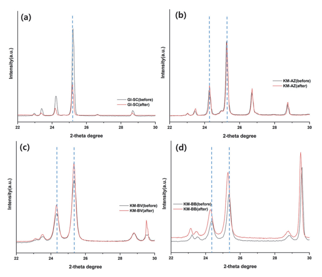 GI-SC는 이 영역에서의 피크가 상당히 약한 것을 볼 수 있으나 나머지 시료들의 경우 이 영역에서 비교적 뚜렷한 피크를 보였다. KM-BB의 경우