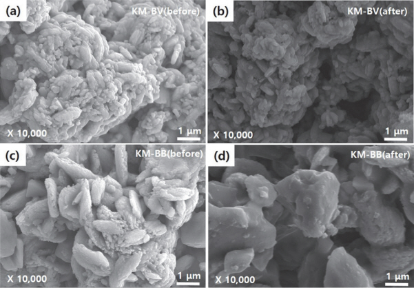 KM-BV는 Cu의 함량이 91%이고, KM-BB는 71%이며, Ca의 함량이 KM-BV가 4%, KM-BB가 20%로 KM-BB의 Ca 함량이 KM-BV보다