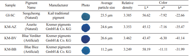 알려져 있다. 본래 Blue bice와 Blue verditer는 동일한 물질을 지칭하는 것으로 알려져 있는데 육안 상으로도 큰 차이가 없었다. 표 1과 같이 GI-SC와 KM-AZ는 천연 안료이고, KM-BV와 KM-BB는 합성 안료로 이후에는 시료명으로 표기하기로 한다.