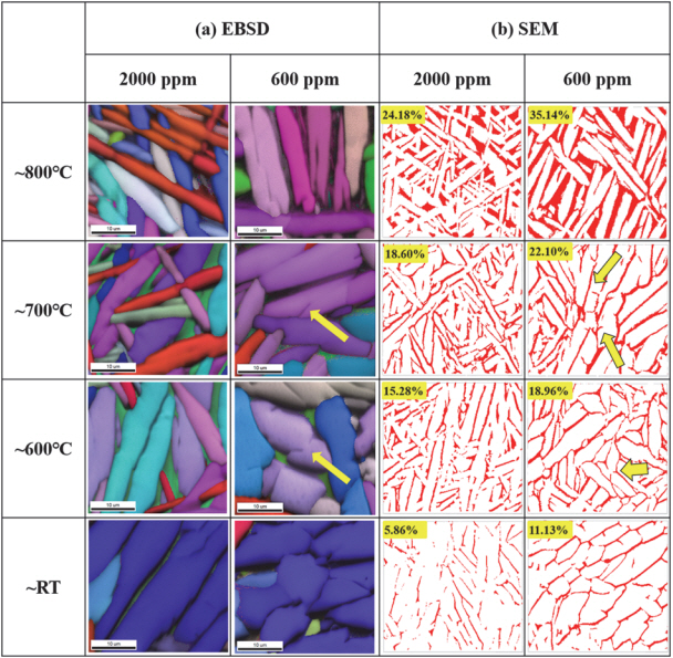 변화가 발생하지 않기에[15] 본 시험에서 배제하고 상온까지 노냉한 미세조직만 고려하였다. Fig 3는 상술한 추가시험에 따른 2000 및 600 ppm 조형체의 미세조직 특성을 나타낸다. 2000 ppm에서는 lath의 성장이 명백히 관찰된 반면