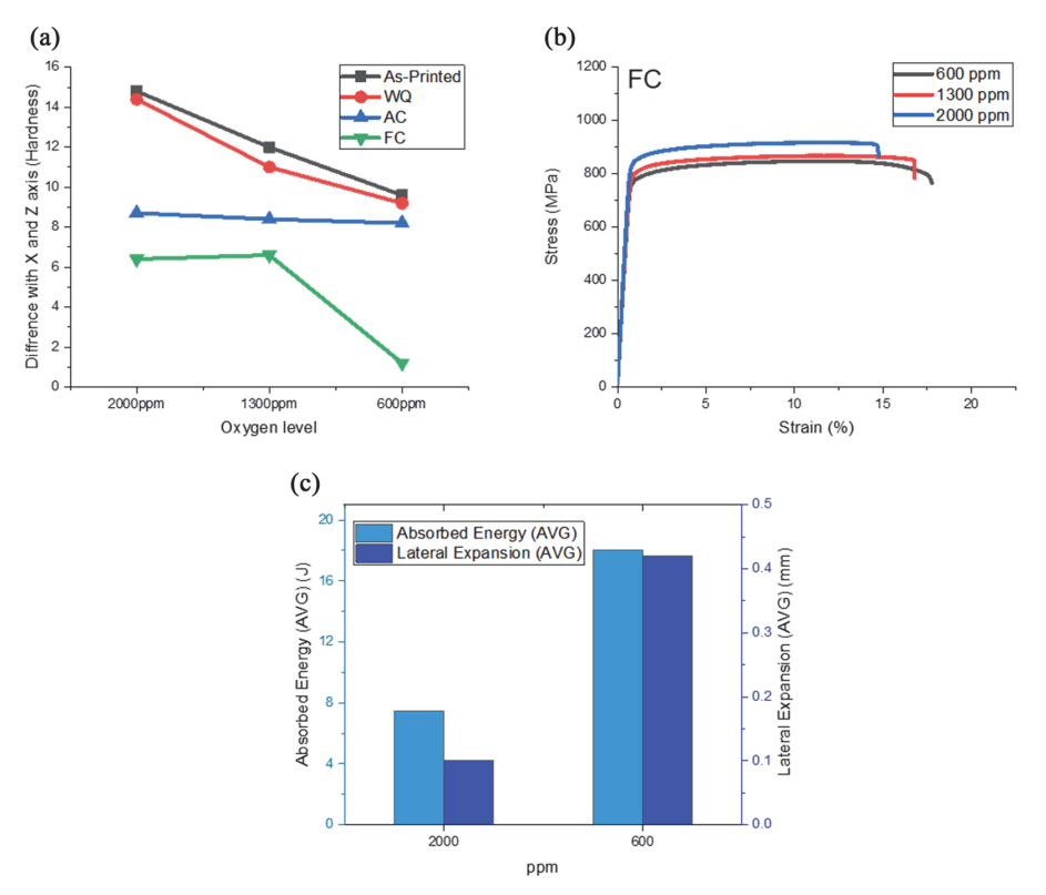 조형체는 18 J의 흡수에너지와 0.4mm의 횡팽창 값을 가진다. 인장시험과 마찬가지로, 저산소 조형체 내부에서 활성화된 구상화로 인해 더 높은 흡수