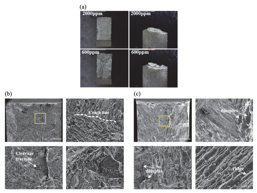 적층제조 조형체의 약점인 취성을 검토하기 위해 노냉 처리한 2000 및 600 ppm 조형체를 대상으로 샤르피 충격시험을 진행한 결과를 Fig 5c에 나타내었다. 고산소(2000 ppm) 조형체의 경우 평균 8 J의 흡수에너지와 0.1 mm의 횡팽창 길이를 기록한 반면, 저산소(600 ppm)