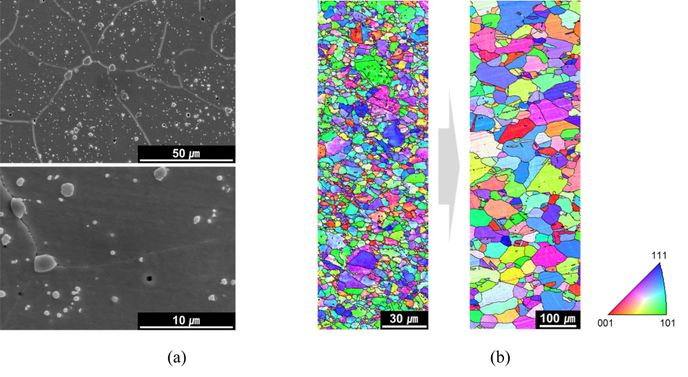 처리를 수행하였다. 균질화 처리 과정 중 많은 석출물이 용해되어 석출물의 분율이 감소함을 확인할 수 있었다. 그림 3(b)는 균질화 처리 전/후 EBSD IPF map으로 grain size가 5.7µm에서 48.4µm로 크게 증가되었으며, 이는 석출물의 감소로 인해