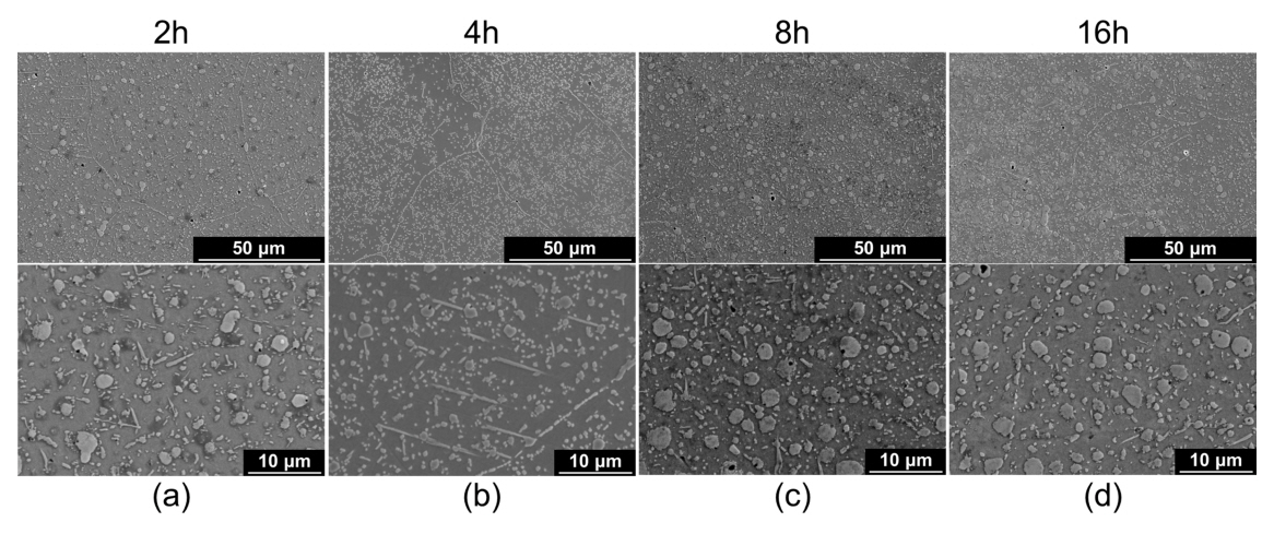 SEM images of the alloy exposed at 1000°C for (a) 2h, (b) 4h, (c) 8h, and (d) 16h
