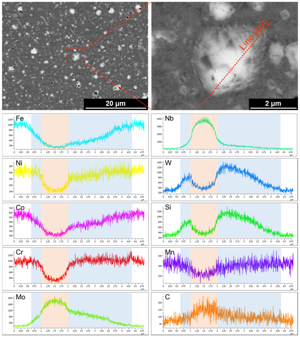 추가로, 결정립 내부에 조대하게 관찰되는 석출물 중 일부는 석출물 내 조성이 두 영역으로 구분되어 관찰되었으며, 그림 5는 해당 석출물의 SEM-EDS line scanning 분석 결과를 나타내었다. SEM-BSE 이미지에서 흐릿하게 나타나는 경계를 기준으로 가운데