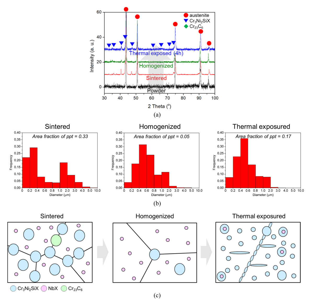 관찰하였다. Alloy1.4957 분말을 1165°C에서 고온등방가압으로 소결 시 Cr3Ni2SiX, Cr23C6, NbX 상이 형성됨을 확인하였다. 이 후 1250°C에서 균질화 처리 시 고온 안정성이 뛰어난 NbX를 제외한 Cr3Ni2SiX와 Cr23C6의 상당량이 용해되어 합금 내 석출물의 분율이 감소하였다. 하지만, 다시 1000°C에 열간 노출 시 많은 양의 Cr3Ni2SiX가 석출됨을 확인하였다.