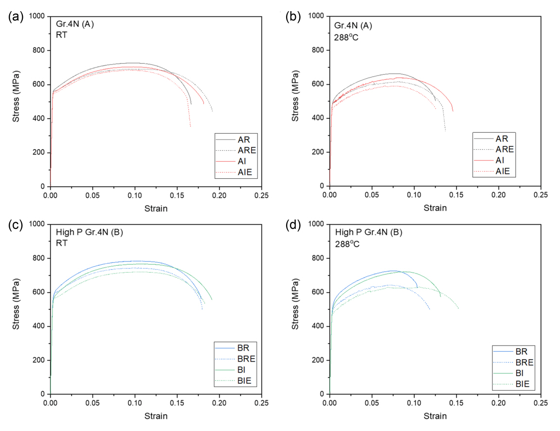 A강과 B강들의 상온, 288°C 인장시험 하중-변위 곡선을 그림 6에 나타내었으며, 항복강도, 인장강도, 연신율을 표 3에 정리하였다. AR 시편은 상온에서 항복강도 573 MPa, 인장강도 729 MPa, 연신율 17%를 보여주었으며, 288°C에서는 강도와 연신율이