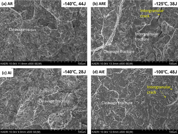 A강과 B강의 온도별 충격흡수에너지와 천이곡선을 그림 7에 나타내었으며, 천이곡선으로부터 구한 상부흡수에너지 (USE), 연성취성 천이온도(DBTT), index 온도(T41J, T68J) 값을 표 4에 정리하였다. AR 시편의 경우 USE는 241J, DBTT -103°C, T41J -140°C로 우수한 인성과 천이특성을 보여주었다. 템퍼취화 열처리시 USE는 30J 증가하였으나 DBTT는 40°C, T41J은 30°C 증가해 천이특성은 저하되는 것으로 나타났다. 이상영역열처리를 적용한 AI 시편은 AR 시편보다 상부흡수에너지는 증가하고 천이특성에는 큰