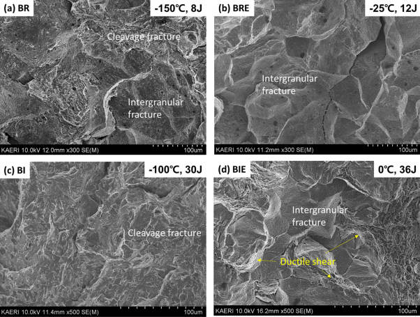 Energy, USE), Index temperature T41J을 측정하였다. Index temperature T41J은 Charpy 흡수에너지가 41J일 때의 온도로 원자로용기강의 천이특성을 평가할 때 쓰이는 온도다.