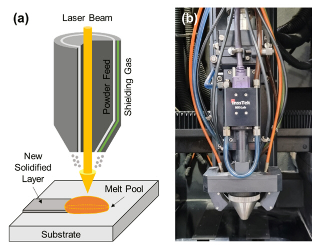 Fig 1 (a)์ L-DED ๊ณต์ ์ ๋ชจ์๋๋ฅผ, Fig 1 (b)์ ๋ณธ ์ฐ๊ตฌ์์ ์ฌ์ฉํ L-DED ์ฅ๋น ์ฌ์ง์ ๋ํ๋ด์๋ค. ๋ณธ ์ฐ๊ตฌ์์๋ L-DED ์ฅ๋น๋ก ์ต๋ 500 W์ ๋ ์ด์ ์ถ๋ ฅ์ ๊ฐ์ง๋, laser spot