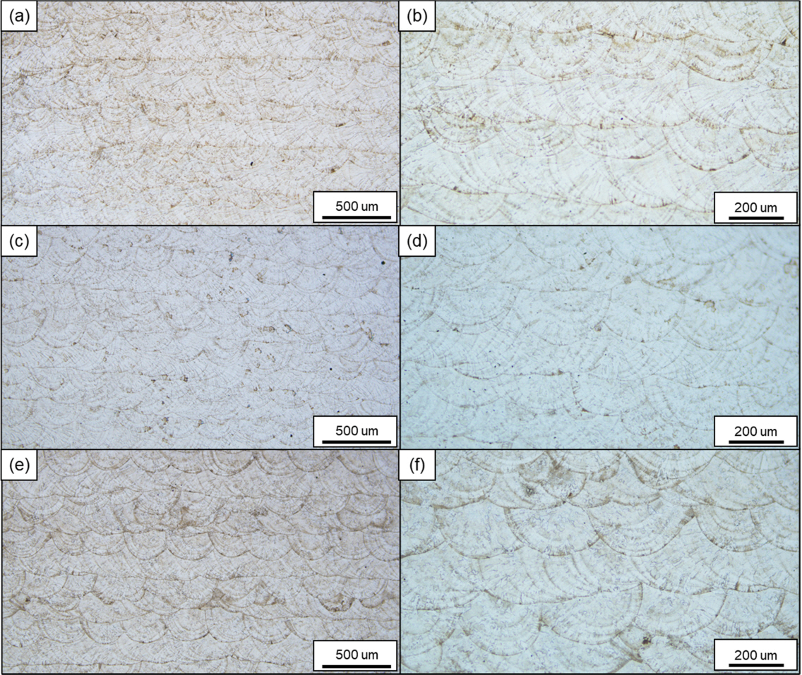 OM image of the specimen (a), (b) 960 mm/min โ 170 W (c), (d) 1,080 mm/min โ 190 W