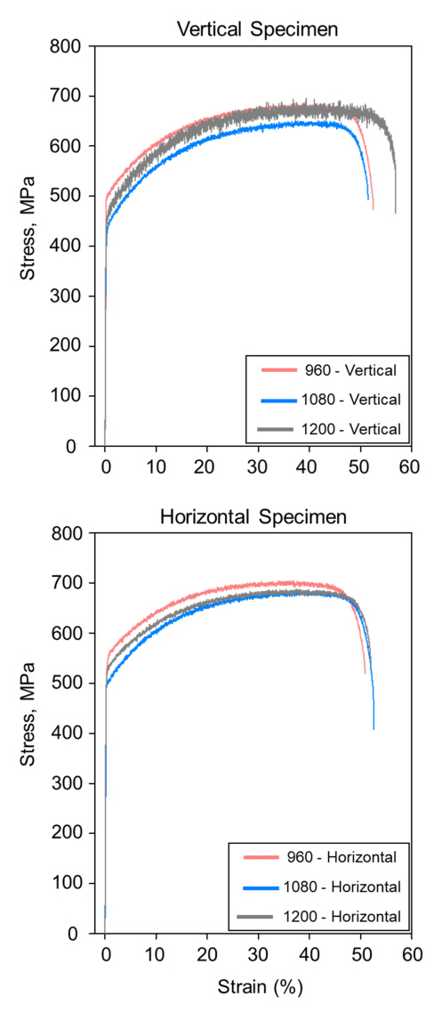 Stress-strain graph for vertical tensile specimen and horizontal tensile specimen