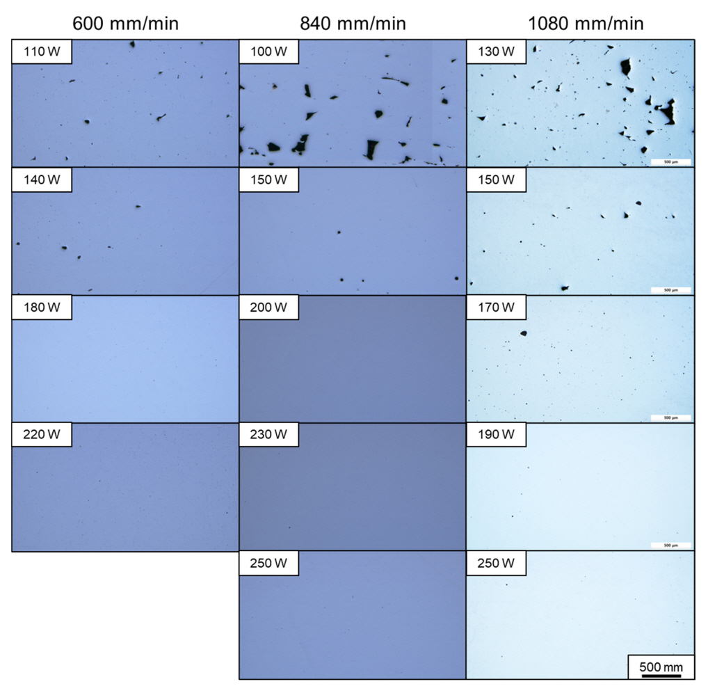OM image of the top layer (a) 600 mm/min - 110 W (b) 1,080 mm/min - 170 W (c) 600