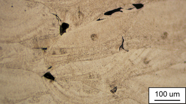 OM image of lack of fusion defect in cube specimen produced by 600 mm/min โ 110 W