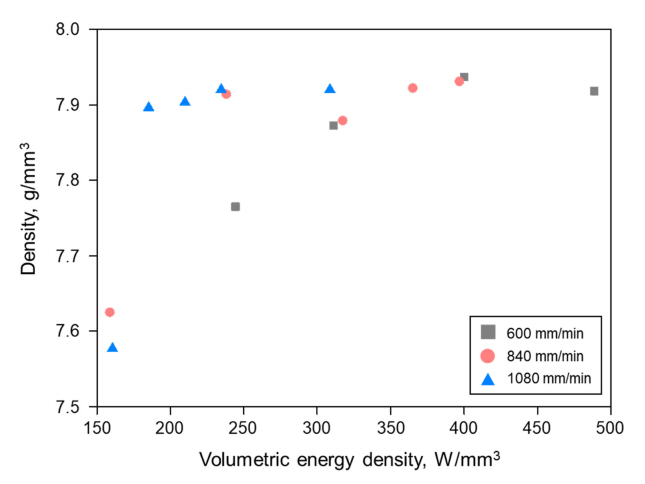 Density per volumetric energy density for cube specimens.