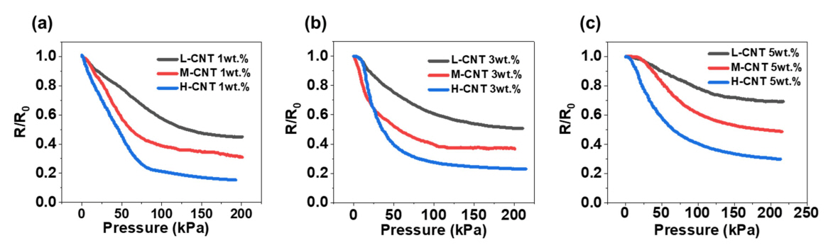 실시간 저항 측정 실험에서는 필러의 함량과 CNT의 종횡비에 따라 CNT/PDMS 복합체에 가해지는 압력에 따른 저항의 변화를 측정하였다. 그림 5는 CNT 3종에 대해 1 wt.% (그림 5(a)), 3 wt.% (그림 5(b)), 5 wt.% (그림 5(c))의 함량의 복합체를 0-200 kPa의 압력에 대한 실시간 저항을 R/R0로 나타낸 그래프이다. 이 때, R은 실시간 저항을 의미하며, R0는 초기 저항을 의미한다.