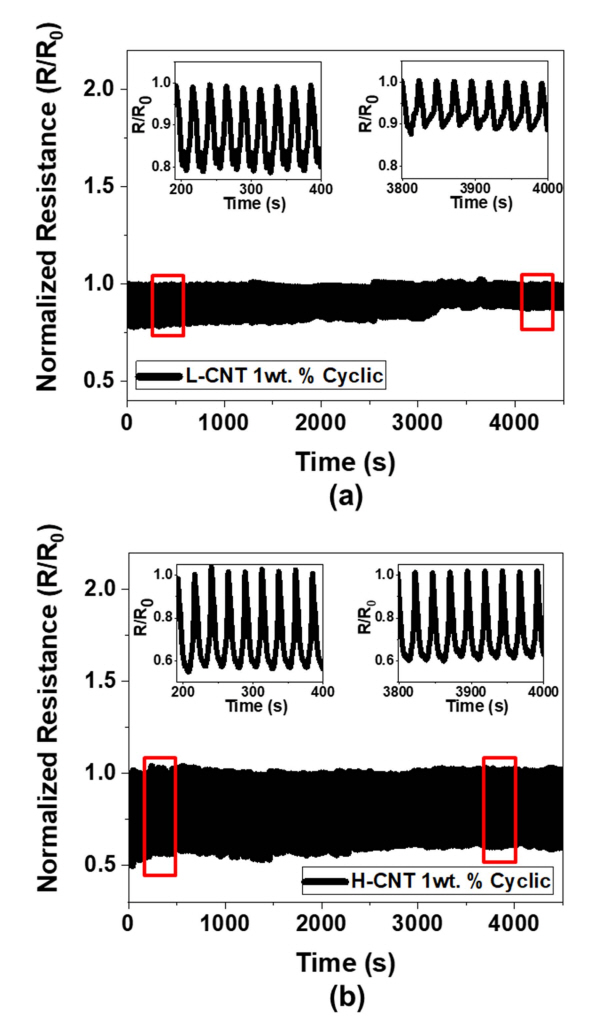 Normalized resistance (R/R0) change under 150 cycle tests at 40 kPa (a) 1 wt.% L-CNT/PDMS and (b) 1 wt.% H-CNT/PDMS